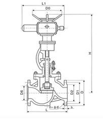 五、J941H/W電動截止閥--主要尺寸和重量 1.6MPa | 1.6MPa | DN | L | D | D1 | D2 | b | n-φd | H | Do | 重量 | 凸面 法蘭 RF J941H J941Y J941W J941F J941N 16C 16P 16R 16I | 10 | 130 | 90 | 60 | 40 | 14 | 4-14 | 198 | 120 | 4.9 | | 15 | 130 | 95 | 65 | 45 | 14 | 4-14 | 218 | 120 | 5.3 | | 20 | 150 | 105 | 75 | 55 | 14 | 4-14 | 258 | 140 | 7.0 | | 25 | 160 | 115 | 85 | 65 | 14 | 4-14 | 275 | 160 | 7.4 | | 32 | 180 | 135 | 100 | 78 | 16 | 4-18 | 280 | 180 | 8.3 | | 40 | 200 | 145 | 110 | 85 | 16 | 4-18 | 330 | 200 | 12.6 | | 50 | 230 | 160 | 125 | 100 | 16 | 4-18 | 350 | 240 | 14 | | 65 | 290 | 180 | 145 | 120 | 18 | 4-18 | 400 | 280 | 22.7 | | 80 | 310 | 195 | 160 | 135 | 20 | 8-18 | 355 | 280 | 29 | | 100 | 350 | 215 | 180 | 155 | 20 | 8-18 | 415 | 320 | 32.8 | | 125 | 400 | 245 | 210 | 185 | 22 | 8-18 | 460 | 360 | 79.5 | | 150 | 480 | 280 | 240 | 210 | 24 | 8-23 | 510 | 400 | 93 | | 200 | 600 | 335 | 295 | 265 | 26 | 12-23 | 710 | 400 | 179 | | 250 | 622 | 405 | 355 | 320 | 30 | 12-25 | 786 | 450 | 441 | | 300 | 698 | 460 | 410 | 375 | 30 | 12-25 | 925 | 500 | 646 |