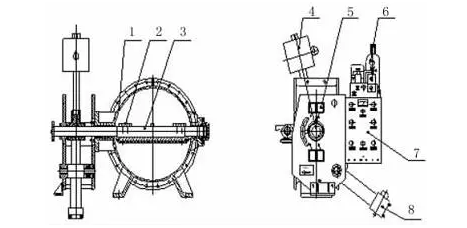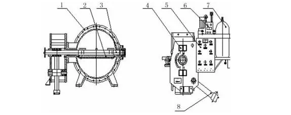 1-閥體;2-碟板;3-閥桿;4-重錘;5-行程開關; 6-液壓站;7-電控柜;8-液壓缸 圖1 重錘式液控緩閉蝶閥