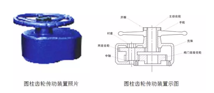 用圓柱齒輪機構啟閉或調節閥門的驅動裝置,亦稱正齒輪傳動。