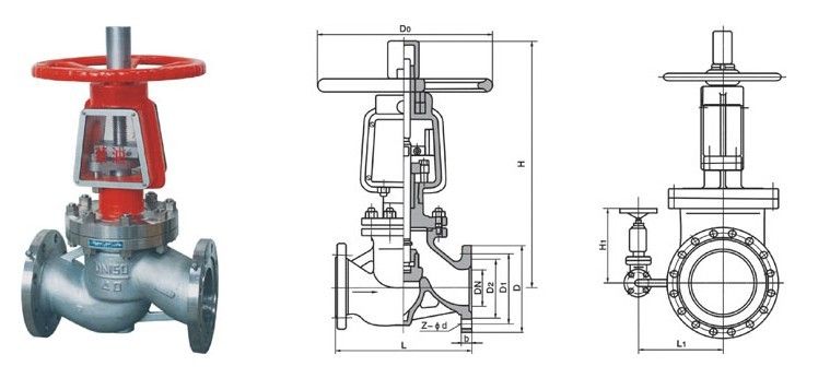| YJ41W-40P、YJ41W-40R | 重 量 (kg) | 公稱通徑 DN(mm) | 尺 寸 (mm) | | L | D | D1 | D2 | D6 | b | f | fz | z-фd | Dz | i | H | D0 | | 15 | 130 | 95 | 65 | 45 | 40 | 16 | 2 | 4 | 4-ф14 | 82 | 10 | 202 | 100 | 5 | | 20 | 150 | 105 | 75 | 55 | 51 | 16 | 2 | 4 | 4-ф14 | 95 | 13 | 225 | 100 | 6.5 | | 25 | 160 | 115 | 85 | 65 | 58 | 16 | 2 | 4 | 4-ф14 | 98 | 15 | 236 | 125 | 7 | | 32 | 190 | 135 | 100 | 78 | 66 | 18 | 2 | 4 | 4-ф18 | 120 | 28 | 312 | 180 | 13.5 | | 40 | 200 | 145 | 110 | 85 | 76 | 18 | 3 | 4 | 4-ф18 | 135 | 20 | 328 | 160 | 16 | | 50 | 230 | 160 | 125 | 100 | 88 | 20 | 3 | 4 | 4-ф18 | 160 | 25 | 450 | 320 | 32 | | 65 | 290 | 180 | 145 | 120 | 110 | 22 | 3 | 4 | 8-ф18 | 180 | 30 | 530 | 360 | 45 | | 80 | 310 | 195 | 160 | 135 | 121 | 22 | 3 | 4 | 8-ф18 | 195 | 32 | 560 | 400 | 60 | | 100 | 350 | 230 | 190 | 160 | 150 | 24 | 3 | 4.5 | 8-ф23 | 230 | 40 | 618 | 450 | 80 | | 125 | 400 | 270 | 220 | 188 | 176 | 28 | 3 | 4.5 | 8-ф25 | 275 | 42 | 675 | 450 | 105 | | 150 | 480 | 300 | 250 | 218 | 204 | 30 | 3 | 4.5 | 8-ф25 | 330 | 50 | 743 | 560 | 134 | | 200 | 600 | 375 | 320 | 282 | 260 | 38 | 3 | 4.5 | 12-ф30 | 405 | 55 | 850 | 640 | 266 | | 250 | 650 | 445 | 385 | 345 | 313 | 42 | 3 | 4.5 | 12-ф34 | 480 | 88 | 975 | 720 | 491 | | 300 | 750 | 510 | 450 | 408 | 364 | 46 | 4 | 4.5 | 16-ф34 | 520 | 100 | 1115 | 800 | 705 | | 400 | 950 | 655 | 585 | 535 | 474 | 58 | 4 | 5 | 16-ф41 | 650 | 140 | 1425 | 900 | 1234 |