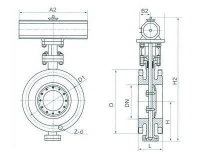 公稱通徑 DN | 結構長度L | 外形尺寸(參考值) | 連接(標準值) | 參考 重量Dt343H | | H | Dt343H | PN0.6MPa | PN1.0MPa | | mm | inch | 短 | 長 | H1 | A1 | B1 | D | D1 | z-d | D | D1 | z-d | | 50 | 2 | 108 | 150 | 112 | 350 | 180 | 200 | 140 | 110 | 4-14 | 165 | 125 | 4-18 | 17 | | 65 | 5/2 | 112 | 170 | 115 | 370 | 180 | 200 | 160 | 130 | 4-14 | 185 | 145 | 4-18 | 20 | | 80 | 3 | 114 | 180 | 120 | 380 | 180 | 200 | 190 | 150 | 4-18 | 200 | 160 | 8-18 | 23 | | 100 | 4 | 127 | 190 | 138 | 420 | 180 | 200 | 210 | 170 | 4-18 | 220 | 180 | 8-18 | 25 | | 125 | 5 | 140 | 200 | 164 | 460 | 180 | 200 | 240 | 200 | 8-18 | 250 | 210 | 8-18 | 40 | | 150 | 6 | 140 | 210 | 175 | 555 | 270 | 280 | 165 | 225 | 8-18 | 285 | 240 | 8-22 | 47 | | 200 | 8 | 152 | 230 | 208 | 605 | 270 | 280 | 320 | 280 | 8-18 | 340 | 295 | 8-22 | 60 | | 250 | 10 | 165 | 250 | 243 | 680 | 270 | 280 | 375 | 335 | 12-18 | 395 | 350 | 12-22 | 95 | | 300 | 12 | 178 | 270 | 283 | 800 | 380 | 420 | 440 | 395 | 12-22 | 445 | 400 | 12-22 | 124 | | 350 | 14 | 190 | 290 | 310 | 835 | 380 | 420 | 490 | 445 | 12-22 | 505 | 460 | 16-22 | 181 | | 400 | 16 | 216 | 310 | 340 | 915 | 450 | 470 | 540 | 495 | 16-22 | 565 | 515 | 16-26 | 260 | | 450 | 18 | 222 | 330 | 380 | 960 | 480 | 490 | 595 | 550 | 16-22 | 615 | 565 | 20-26 | 338 | | 500 | 20 | 229 | 350 | 410 | 1020 | 480 | 490 | 645 | 600 | 20-22 | 670 | 620 | 20-26 | 360 | | 600 | 24 | 267 | 390 | 470 | 1225 | 480 | 660 | 755 | 705 | 20-26 | 780 | 725 | 20-30 | 540 | | 700 | 28 | 292 | 430 | 550 | 1355 | 640 | 660 | 860 | 810 | 24-26 | 895 | 840 | 24-30 | 580 | | 800 | 32 | 318 | 470 | 640 | 1470 | 640 | 660 | 975 | 920 | 24-30 | 1015 | 950 | 24-33 | 845 | | 900 | 36 | 330 | 510 | 710 | 1545 | 750 | 860 | 1075 | 1020 | 24-30 | 1115 | 1050 | 28-33 | 1050 | | 1000 | 40 | 410 | 550 | 770 | 1795 | 850 | 860 | 1175 | 1120 | 28-30 | 1230 | 1160 | 28-36 | 1500 | | 1200 | 48 | 470 | 630 | 890 | 1965 | 850 | 900 | 1405 | 1340 | 32-33 | 1455 | 1380 | 32-39 | 2000 |