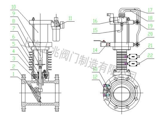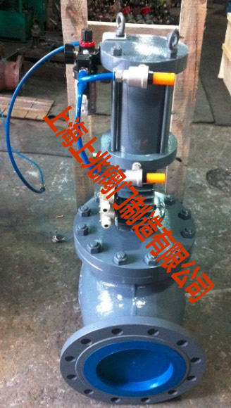 1.該氣動抽氣止回閥采用獨立的逆止閥和輔助氣動關閉裝置相結合的結構型式(氣源用戶自備),當汽輪機開始工作時,控制系統裝置中的氣源通過電磁換向閥進入助關氣缸的下腔,推動助關氣缸活塞向上移動,壓縮彈簧并使彈簧蓄能,閥板在管路介質的推動下開啟。當系統故障時,管路介質壓力降底,閥板在自身重力的作用下關閉,此時控制系統供氣電磁換向閥接受信號氣源換向,使氣體進入助關氣缸的上腔,與彈簧一起推動氣缸活塞向下移動,幫助閥板以最快的速度關閉,閥門在閥板關閉后從輔助動力裝置獲得一定鎖閉閥板力,以防管路系統蒸汽和冷嶷水倒流,保護汽輪機等主要設備。 2.閥門執行機構采用氣開式,一旦電磁換向閥接受信號氣源換向,執行機構彈簧和電磁換向閥氣源能使閥門迅速關閉,關閉時間0.5~1秒。