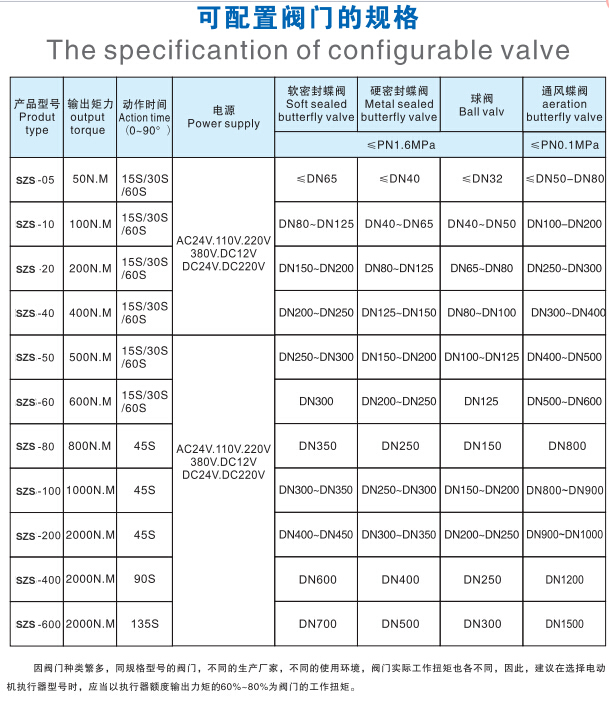 產(chǎn)品介紹 SZS精小型電動執(zhí)行器產(chǎn)品介紹: 快開電動執(zhí)行器適用于快開需求的球閥,蝶閥等電動快速 - 開關(guān)閥,快開電動球閥,快開蝶閥等。 0-90°全行程:全開,全程單向動作時間2秒(快速切換)。 適用于壓力高,壓差大,不能使用電磁閥的高開啟場合。 適配閥門:球閥、V型調(diào)節(jié)閥、蝶閥、通風(fēng)閥門、風(fēng)門、風(fēng)機、動態(tài)平衡閥、旋塞閥等部分旋轉(zhuǎn)閥和其他工業(yè)領(lǐng)域的機械定位旋轉(zhuǎn)。 快開電動執(zhí)行器在1500V高壓測試后沒有漏電流,確保您的系統(tǒng)完全正常運行。 ★長壽命設(shè)計 超過50,000次開啟 - 現(xiàn)場無故障運行,您的系統(tǒng)可靠無憂! ★DDS交換機調(diào)試技術(shù) DDS交換機調(diào)試技術(shù),直接調(diào)試交換機,改變了傳統(tǒng)繁瑣的調(diào)試步驟原有工業(yè)中的電動閥和電動執(zhí)行器,直接簡化為一步操作和調(diào)試。 旋轉(zhuǎn)表盤頂部旋鈕,輕松完成電動執(zhí)行器后的電氣和機械位置校準(zhǔn)。連接到閥門。 精致的小型設(shè)計 重量輕,適用于各種角行程閥(球閥,蝶閥,旋塞??閥等)和閥門共同構(gòu)成電動控制閥,電動球閥,電動蝶閥和其他工業(yè)自控電動閥。 本實用新型體積小,管道上各種角度安裝方便,適用于各種復(fù)雜的管道和工況。 ★良好的密封性能 執(zhí)行器密封標(biāo)準(zhǔn) - 執(zhí)行器整體浸入水中,無氣泡泄漏。 特別適用于室外露天環(huán)境。 ★良好的可靠性 產(chǎn)品電氣元件和各種精密零件均采用進口元件,確保高品質(zhì)和可靠性。 良好的耐壓性 ZSZ精小型電動執(zhí)行器,1500V高壓測試,無泄漏,確保您的系統(tǒng)完全正常運行 ZSZ精小型電動執(zhí)行器可配閥門選型表: ![]() | ||