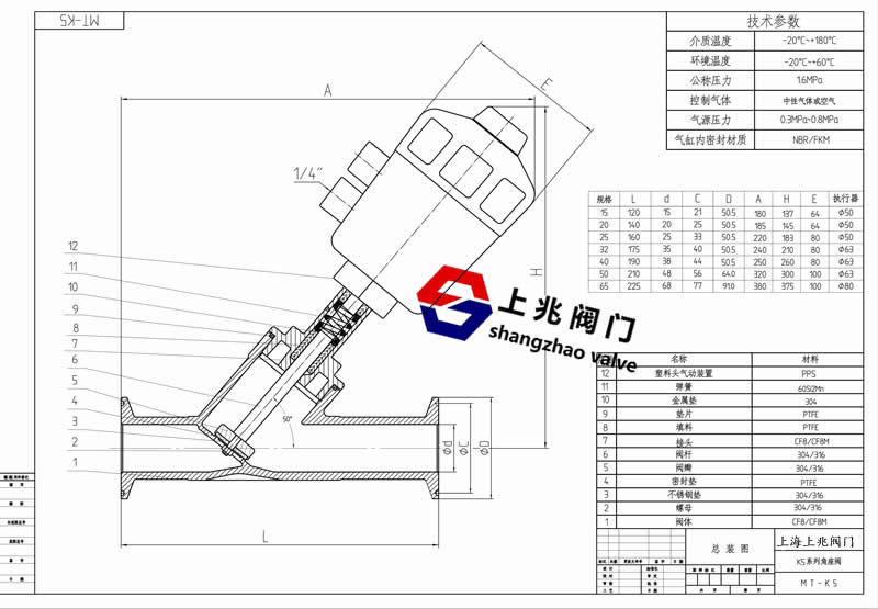 產品介紹 快裝氣動角座閥(塑料頭)--工作原理: 在非工作狀態時,由于彈簧力作用,閥門常閉(開)。當執行器活塞被壓縮氣體作用時,閥門打開(關閉)。雙作用形式靠壓縮氣體控制閥門開關。 快裝氣動角座閥(塑料頭)--應用范圍: 啤酒飲料灌裝設備 制藥及醫療設備 印染紡織 化工行業 氣體工業 高溫滅菌 發泡機械 水/污水處理 快裝氣動角座閥(塑料頭)--特點: 流量大,流阻小,無水錘 Y型設計,增加30%流量 超長使用壽命 閥桿自動校正,自潤滑,免維護 氣缸采用不銹鋼材質,在惡劣環境中更加優秀,可360°旋轉。 快裝氣動角座閥(塑料頭)--技術參數: 管道壓力:Max1.6Mpa(232psi) 控制壓力:0.3-0.8Mpa(43.5-116psi) 控制介質:中性氣體或空氣 閥體材料:CF8M/CF8(SS316,SS304) 密封材料:聚四氟乙烯 氣缸材料:塑料PPS 氣缸尺寸:27mm,32mm,40mm,50mm,63mm, 80mm,100mm,125mm 適用介質:水,酒精,油,染料,蒸汽,中性氣體或液體,有機溶劑,酸堿溶液 介質溫度:-10℃-+180℃,25℃-+220℃ 環境溫度:-10℃-+80℃ 控制形式:單作用常閉,常開,雙作用常閉,雙作用自由態 連接形式:螺紋式,焊接式,法蘭式,快裝式 快裝氣動角座閥(塑料頭)圖紙: ![]() | ||