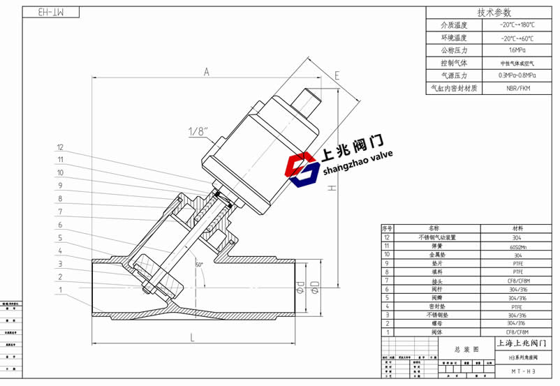產品介紹 焊接氣動角座閥--產品介紹 : 氣動角座閥以316不銹鋼為主要制造材質,廣泛用于啤酒,紡織印染和漂白,制藥及醫療設備,食品加工,橡膠機械,有機和無機化工,清洗消毒高溫滅菌,水處理等行業,適用于介質為水,液體,中性氣體,水蒸汽,輕微腐蝕性氣體及液體,與電磁閥及其他閥門相比,具有投資經濟,使用安全,免維護,壽命長的特點。 焊接氣動角座閥--選項參數: 氣缸材質:不銹鋼/聚酰胺 閥座密封:PTFE(溫度-20℃~+180℃)/F46(-20℃~+220℃) 選配附件:電磁閥/限位開關反饋信號/電氣定位器/空氣過濾減壓閥 控制形式 直動式 閥體 不銹鋼CF8M 結構 角座閥 閥芯材料 不銹鋼 接口 G1/2-G2 閥座密封 PTEF 粘度 600mm2/s 活塞密封 FKM/NBR 介質溫度 PTFE:-10℃~+180℃ 安裝 任何位置 環境溫度 -10℃~+60℃ 控制介質 空氣 中性 氣體 蒸汽焊接式氣動角座閥零件表 名稱 材料 名稱 材料 閥體 CF8M 鎖緊螺母 Hpb59-1 六角螺母 1Cr18Ni9Ti 指示桿 Hpb59-1 閥芯密封墊 PTFE 常閉彈簧 65Mn-D 閥芯體 OCr178Ni12Mo2 缸體 CF8M 閥體密封墊 FKM 頂蓋 PC 連接 CF8M Y型圈 FKM 閥桿 OCr178Ni12Mo2 O型圈 NBR 閥桿密封套 PTFE 閥蓋 CF8M 閥桿密封圈 PTFE 含油軸承 壓緊密封墊 PTFE 墊圈 Hpb59-1 彈簧擋圈 活塞環 FKM 密封彈簧 65Mn-D 活塞 Hpb59-1 參數 接口 英寸 內孔 mm KV值 m3/h 最大工作 壓力(bar) 要求最小 氣源壓力(bar) 執行機構 尺寸mm 流向 G3/8 13 3.7 0-16 4.0 40 閥座上方 G1/2 13 4.2 0-16 2.7 50 閥座上方 G3/4 20 8.0 0-16 2.7 50 閥座上方 G1 25 19.0 0-16 2.0 63 閥座上方 G11/4 32 27.5 0-16 2.0 63 閥座上方 G11/2 40 42.0 0-16 2.0 63 閥座上方 G2 50 52.0 0-16 2.0 63 閥座上方 G21/2 65 77.0 0-14 1.6 80 閥座上方1.氣動角座閥按汽缸可分為: 單作用和雙作用 單作用(氣動頭通常為一個孔);工作原理;根據彈簧復位達到開啟和關閉的作用,分為常開型與常閉型。 雙作用(氣動頭通常為兩個孔);工作原理:給氣控制其開關。 壓力范圍:0-1.6Mpa 介質溫度:-10 ℃ ~+180 ℃ 環境溫度:-10 ℃ ~+60 ℃ 閥體材料:不銹鋼 密封材料:聚四氟乙烯 執行機構外殼:聚酰按、不銹鋼 氣動角座閥在生活中的應用: 控制氣體:中性氣體,空氣 控制液體:自動化工業控制流體、食品級乳工業、生活用水、普通管道流體介質等。 2.焊接氣動角座閥--應用范圍: ①,啤酒飲料等灌裝設備/beer & drinks filling machinery; ②,印刷紡織/textile printing&dying; ③,氣體工業/gas industry; ④,制藥及醫療設備/pharmacy & medical equipment; ⑤,化工行業/chemical industry; ⑥,高溫滅菌/disinfection; ⑦,發泡機械/frothing equipment; ⑧,水污染處理/water sewage disposal。 3.角閥工作原理: 在非工作狀態下,由于彈簧的作用,閥門常開或常閉。當執行器活塞被壓縮氣體作用時,閥門打開或關閉,雙作用形式靠壓縮氣體來控制閥門開關 ⒉安裝環境: ①,控制形式:直動式; ②,管道壓力:MAX 1.6MPA(232psi); ③,控制壓力:0.3-0.8MPA(43.5-116psi); ④,結構:角式 ⑤,接口:DN10-DN100; ⑥,介質粘度:600MM2/S; ⑦,介質溫度:-10度-+180度(PTFE); ⑧,環境溫度:-10度-+60度; ⑨,安裝位置:任意位置(360度任選位置安裝)。 4.安裝與拆卸: ①,連接閥門至管道,確保閥體所附箭頭與流體方向一致(閥體外側箭頭代表流體流動方向,安裝請遵循); ②,焊接式安裝:焊接時請拆離執行器; ③,螺紋、法蘭、快裝式安裝:可正常安裝; ④,拆卸:拆卸前確保對閥門的氣壓已解除;輕卸;拆卸后保護好螺紋和密封材料; ⑤,閥體與管道連接緊固需要足夠的扭矩力,個尺寸扭矩力值如下:DN15為40Nm,DN20為50Nm,DN25為70Nm,DN32為150Nm,DN40為150Nm,DN50為170Nm,DN80為240Nm,DN100為300Nm。 ⑥,安裝時,請確保管道內和接口處無殘留物。 ⑦,安裝后,檢測與連接處已密封完好,無泄漏,方可使用。 ⒌保修服務: 上兆閥門,質量優秀,性能卓越。其任何一款閥門的出廠都經過生產檢驗,包裝檢驗和出廠檢驗三道嚴格的檢驗的程序,確保了用戶能享受到佳信閥門完美的品質服務。但任何產品都難免有瑕疵,如果在您正確使用我司產品的基礎上出現任何質量問題。 ![]() | ||