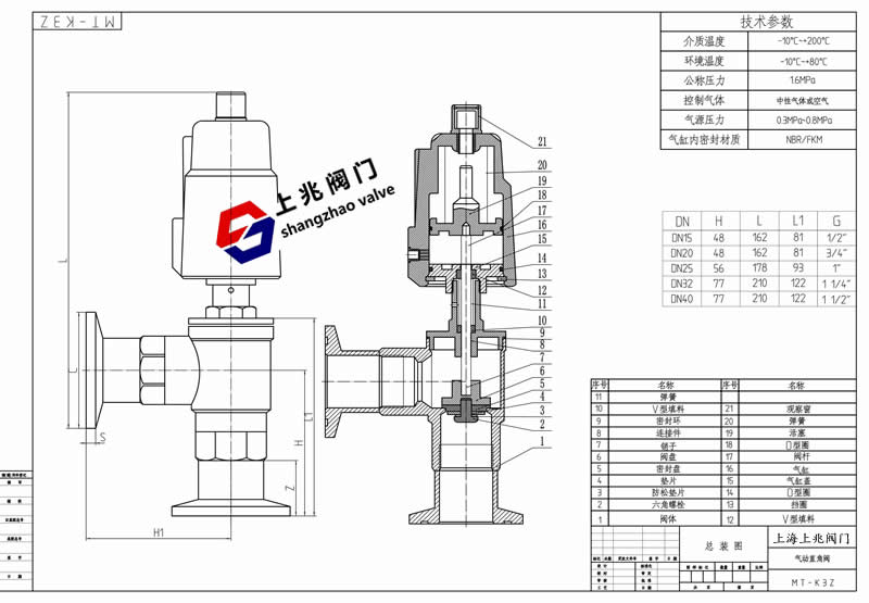 產品介紹 快裝氣動直角閥--工作原理: 可調節活塞開度,限制行程,調節閥門流量,適用于所有型號的角座閥,另外在無控制氣源、機械(電磁)故障時還可以用來緊急制動。 閥體材料:不銹鋼SS316/SS304/黃銅 執行器材料: SS304不銹鋼 閥盤密封:PTFE/FPM 閥桿密封:PTFE/FPM 活塞密封:FPM/NBR 快裝氣動直角閥--技術參數: 接口尺寸:DN10-DN65 螺紋:3/8‘’--21/2‘’ 適用介質:水,中性氣體和液體,酒精,油,有機溶劑,水蒸氣,弱酸弱堿溶液。 介質溫度:PTFE:-10℃-+200℃ FPM:-10℃-+100℃ 順流安裝/逆流安裝 控制介質:空氣/中性氣體 控制壓力范圍 :0.3-0.8MPa 工作壓力:0-1.6MPa 快裝氣動直角閥--應用范圍: 啤酒飲料灌裝設備 制藥及醫療設備 印染紡織 化工行業 氣體工業 高溫滅菌 發泡機械 水/污水處理 快裝氣動直角閥圖紙: ![]() | ||