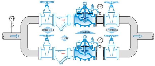 200X減壓穩壓閥由主閥、導閥、針閥、球閥、微型過濾器和壓力表組成水力控制接管系統。使用時,當調定出口壓力后,能自動保持穩定出口壓力。本產品利用導閥自力控制,不需要其它裝置和能源,保養簡便,壓力控制準確度高,受進口壓力和流量影響小,減壓穩壓可靠。廣泛用于高層建筑、生活區等供水管網系統及城市供水工程。