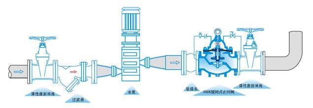 300X緩閉止回閥由主閥、單向閥、針閥、球閥、微形過濾器和壓力表組成水力控制接管系統(tǒng)。利用水力自動操作,可使主閥得到最佳的開啟或關閉速度。防止水鍾水擊的產生,以達到緩閉消聲的效果。利用水力自力控制,不需要其它裝置和能源,保養(yǎng)簡便,開啟及緩閉平穩(wěn)。廣泛用于高層建筑、生活區(qū)等供水管網系統(tǒng)及城市供水工程。