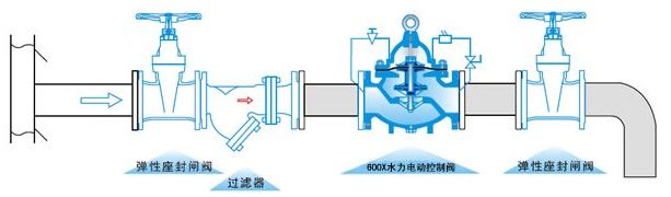 600X水力電動控制閥由主閥、電磁導閥、針閥、球閥、微形過濾器和壓力表組成水力控制接管系統。通過電磁導閥可以實現對閥門開啟和關閉的遙控。加裝附加裝置后,可控制開啟和關閉的速度。本產品利用導閥控制閥門的開啟和關閉,節省能源。可代替其它閥門大型電動裝置。 二、600X水力電動控制閥--工作原理
