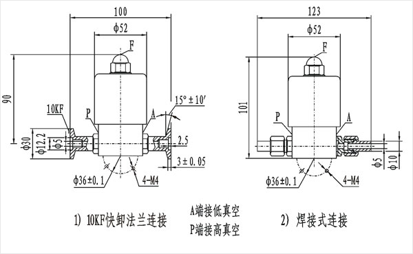 電磁高真空帶充氣閥連接在高低真空系統(tǒng)上,該閥通電閥板打開,同時(shí)封閉充氣口,將P、A端管路接通;斷電時(shí)閥板關(guān)閉,切斷P、A端管路,保證系統(tǒng)的真空度,同時(shí)打開充氣口,通過(guò)F端向A端充氣。